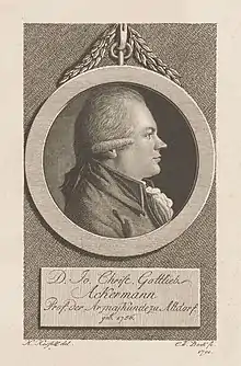 Attending the University of Jena at only fifteen years old, Johann found a teacher in Ernst Gottfried Baldinger. The two relocated to Göttingen where he studied, apart from medicine, the classical sciences, as a student of Christian Gottlob Heyne. Ackermann was promoted in 1775 to private lecturer at the medical faculty of Halle, where he lived for two years. Afterwards, he returned to Zeulenroda to practice medicine and physics. In 1786, he followed a call to Altdorf, where he was appointed professor of chemistry. In 1794 he accepted a position as chair of applied medicine and - at the same time - a position as head of the local hospital for the poor. He died at the age of 45 from tuberculosis.