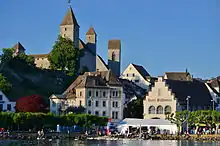 On 18 July 1336, Rudolf Brun, mayor of the city of Zürich, defeated his political opponents, the former members of the Rat (council) of Zürich, of which around 12 members found refuge by count Johann in Rapperswil.[5] In feud (German: Fehde), an approved tradition in medieval law, of the so-called Äusseres Zürich coalition of the Grafschaft Rapperswil, some knights and nobles which supported them, Count Johann became the leader of the opposition in the city of Zürich. Latter was supported among others by the House of Toggenburg as its military arm, as well by the Einsiedeln Abbey which supported Brun's regime.[6]