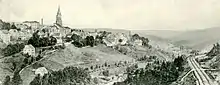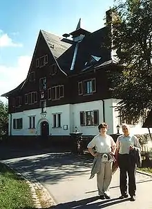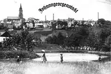 Germany's first ski jump was built in 1929 near Johanngeorgenstadt. It bore the name “Hans-Heinz-Schanze”. In 1934, the formerly abandoned mining industry was taken up again. In the Second World War, with the seizure of owner Arthur Krautmann's “Deutsches Haus” hotel across from the railway station, the town became home to a military hospital. Furthermore, the town harboured a subcamp of the Flossenbürg concentration camp[3] in which countless inmates died. Its prisoners were used as forced labour and were deported mostly from German-occupied Soviet Union, Poland and France.[4] The Johanngeorgenstadt camp was emptied on 13 April 1945 and the inmates were sent on a death march towards Theresienstadt.