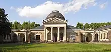 The old burial ground of St. John's was inaugurated in 1575 and had to be expanded in 1633, 1680 and 1721 due to plague. Many prominent Dresden residents such as the builder of the iconic landmark church, baroque Frauenkirche, architect George Bähr, and the greatest Saxon organ builder, Gottfried Silbermann found their final resting place at the old burial ground. The cemetery was closed in 1814 due to lack of space and sanitary reasons, and thus neglected cemetery fell into disrepair. For this reason, the city management decided to relocate the cemetery in 1854, despite citizens' petitions and heavy protests. In 1875, the Protestant church acquired land in the Tolkewitz district in order to establish a new cemetery here to replace the old abandoned cemeteries of the Lutheran St. Johannes, Frauenkirche and Kreuzkirche parishes in Dresden which ran out of space.[2] The new burial ground was consecrated on May 16, 1881, by provost General-Superintendent Moritz Franz and the first burial was recorded on July 17 of the same year.[3] The designated historic landmark chapel with an impressive dome was built by Paul Wallot in 1894 in the Neo-Renaissance style.