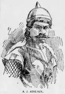 Arneaux started in vaudeville. His first appearance on a major stage was in 1876, when he played Tom Walcott, a Southern Planter, in John S. Ladue's "Under the Yoke, or Bond and Free" at the Third Avenue theatre in New York. He did not immediately pursue a career in acting, but worked for a time as a waiter and also as a barber. In 1883, he published a song, "Jumbo, the Elephant King!".[3] In 1884, at the urge of a theatre manager, he took the role of Iago in Othello at the Brooklyn Athenaeum, for which he received strong praise.[2] This production was organized by Benjamin J. Ford, who had success at the New York City Lyric Theatre in 1878 as the lead of an all-black cast production of Richard III. Ford played the role of Othello, Alice Brooks played Desdemona, Marie Lavere as Emilia, B. C. Devreaux as Michael Cassio, and R. R. Cranvell as Brabantio. The group then formed what was perhaps the first Shakespearean troupe of black actors which became known as the Astor Place Tragedy company. The company was managed by Arneaux and presented plays throughout New York City; its most prominent stage was in November 1884 at the Academy of Music where it presented John Banim's Damon and Pythias, with Arneaux as Damon and Ford as Pythias. John Ladue, Henrietta Vinton Davis, and Belle Martin were also in the production.[4]