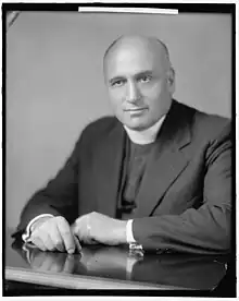 One of Ryan's most controversial ventures into American politics was his national radio endorsement of Democratic Party candidate Franklin D. Roosevelt when he ran for re-election as president in 1936.[29] When the "Radio Priest", Charles Coughlin, turned vehemently against Roosevelt and the New Deal during the 1936 presidential campaign, and encouraged his listeners to vote instead for William Lemke of Coughlin's new Union Party,[30] Ryan countered with an overtly partisan political speech ("Roosevelt Safeguards America") broadcast on national radio on October 8, 1936, urging Catholics to repudiate Coughlin and support the New Deal and Roosevelt. Wary of the potential controversy his speech could arouse, he began the endorsement by stating, "I am making tonight what is liable to be called a political speech. It is not that. It is mainly a discussion of certain political events in the light of moral law." Nevertheless, the endorsement led Ryan into open conflict with Coughlin, who gave Ryan the sarcastic sobriquet "The Right Reverend New Dealer". The speech also cost Ryan the confidence of Archbishop Michael J. Curley of Baltimore.[29]