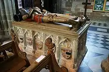 Beauchamp's rapid rise from esquire to baron could not be borne by the Lords Appellant, who included his kinsman, Thomas Beauchamp, 12th Earl of Warwick. The latter probably saw the rise of his cousin as a threat to his dominance of the Midlands.[5] Arrested and imprisoned along with three other household knights, Lord Beauchamp[6] was impeached in the Merciless Parliament and condemned by the lords for treason. He was beheaded on Tower Hill on 12 May 1388 and was buried in Worcester Cathedral. Fortunately for his heir, John Beauchamp, 2nd Baron Beauchamp of Kidderminster, then aged eleven, he had entailed certain of his manors, so these were exempt from forfeiture.[7]