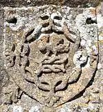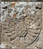 Pair of escutcheons à bouche above SE door of Tawstock Church, Devon: left: showing a falcon atop a Bourchier knot, Representing John Bourchier, 2nd Earl of Bath (1499 – 1560/61); right: showing a peacock in its pride, the crest of Manners, the family of his 2nd wife Eleanor Manners, daughter of George Manners, 11th Baron de Ros