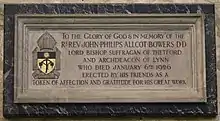 John Bowers was born in Portsea, Portsmouth, Hampshire and educated at Magdalen School and St John's College, Cambridge.[2] His first post after ordination was as a Curate at Coggeshall.[3] From 1882 to 1903 he was Domestic Chaplain to the Bishop of Gloucester and went on to be Diocesan Missioner and a Residentiary Canon at Gloucester Cathedral (1890–1902).[4] In January 1902, he was appointed Archdeacon of Gloucester[5][6] before his appointment as Bishop of Thetford and Archdeacon of Lynn in 1903 which refers to Kings Lynn.