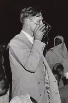 Bowers speaking into a microphone at a 1954 UNESCO event in Mysore, India