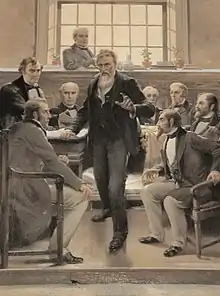 A wagon awaited them at Westport, New York, and took them to Elizabethtown over an abandoned plank road, described as "excessively rough and unpleasant".[31]: 666 Tuesday night, December 6, was spent at Adam's Hotel in Elizabethtown, New York.[33] Brown's body lay in state at the Essex County Courthouse, with an honor guard of six men,[26][20]: 237 [6]: 124 chief among them Orlando Kellogg, "who never tired of telling the story of that December night".[29]: 18 Wendell Phillips gave an impromptu talk of almost two hours on Brown's failed raid, his trial, and his execution.[34] There is a historical marker,[35] and in the Courthouse, since 1923, a painting of John Brown on trial.