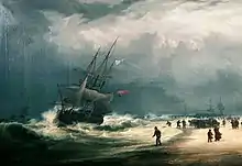 William Joy's growing recognition in Great Yarmouth was mentioned in Druery's account of a local art collection, when he wrote, "...this would be an excellent and appropriate situation for a series of marine paintings by that eminent artist, William Joy, of Great Yarmouth...".[18] His paintings can be the easier to identify, as they are sometimes signed 'W. Joy'. His watercolours and oils have palettes that often include blues, greys, blacks and dark greens, as well as indigo, a pigment which faded over time.[49] He depicted powerful, raging seas, whipped-up foam and storm-tossed ships:[49] The writer Charlotte Miller praises his "gift for capturing the stark horror of disaster at sea".[20] The writer Michael Spender described Joy's work as "undemonstrative and accurate in its nautical detail".[5] His paintings have been compared with Joseph Stannard and Charles Brooking, but according to Walpole, his works lack Stannard's "personal charisma".[49]