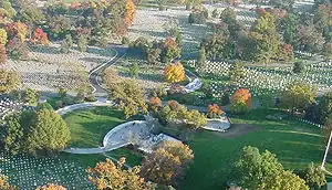 The grave design process was placed under tight secrecy.[44][62][63] An extensive research project was conducted in which hundreds of famous tombs (such as the Mausoleum of Halicarnassus and Grant's Tomb) as well as all existing presidential burial sites.[64] Warnecke discussed design concepts with more than 40 architects, sculptors, painters, landscape architects, stonemasons, calligraphers, and liturgical experts[55][65]—including the sculptor Isamu Noguchi, architectural model maker Theodore Conrad, and the U.S. Commission of Fine Arts.[44][62] Noguchi counseled Warnecke to add a large sculptural cross to the site and to eliminate the eternal flame (which he felt was kitschy).[44] Warnecke consulted with Mrs. Kennedy about the design of the grave many times over the following year.[58] Hundreds of architectural drawings and models were produced to explore design ideas.[55][65] On April 6, 1964, Warnecke sent a memorandum to Mrs. Kennedy in which he outlined his desire to retain the eternal flame as the centerpiece of the burial site and to keep the site's design as simple as possible.[66] In the course of the research and conceptualization effort, Warnecke considered the appropriateness of structures or memorials at the site (such as crosses, shafts, pavilions, etc.), the history of Arlington National Cemetery, the vista, and how to handle ceremonies at the site.[66] By August 1964, Warnecke and his assistants had written a 76-page research report which concluded that the gravesite was not a memorial nor monument, but a grave.[64][66] "This particular hillside, this flame, this man and this point in history must be synthesized in one statement that has distinctive character of its own. We must avoid adding elements that in later decades might become superficial and detract from the deeds of the man," Warnecke wrote[64] For some time in the spring and summer of 1964, the design process appeared to slow as Warnecke and his associates struggled to design the actual graves. But in the summer of 1964 Sargent Shriver, President Kennedy's brother-in-law, forcefully told Warnecke that "There must be something there when we get there."[64] This spurred the design effort forward. In the late summer and early fall, Warnecke considered massive headstones, a sarcophagus, a sunken tomb, a raised tomb, and sculpture to mark the graves.[64] Very late in the design process, two abstract sculptures were designed but ultimately rejected.[64]