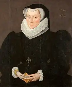 Portrait of Lady Catherine Neville (b.1529/1530), Lady Constable, Aged 60 by Robert Peake the Elder, 1590, located at Lytes Cary Manor, Somerset. It is inscribed on the upper right: 1590 aet 60. A half-length portrait of Catherine Constable, at the age of 60, facing, in black dress and hood, white ruff and cuffs, a gold prayer book in both hands.[2]