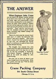 John Crane was founded in 1917 as Crane Packing Company. Before founding his company, engineer John Crane patented a flexible, lubricated metallic packing (#956,042) in 1910.[5] In 1915, Crane patented the manufacturing method for flexible metallic packing (#1,151,344). He discovered that wrapping his flex packing in metallic foil increased its longevity and kept the cylinders’ surface smooth and uniform. Frank Payne, a sales representative for the Warren Packing Company, recognized the potential of Crane’s innovation.[6]