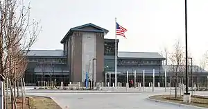 The station is located at 21201 Michigan Avenue (US Highway 12). The red brick and glass-faced structure includes a two-story waiting hall, which includes an elevated glass-enclosed pedestrian bridge which allows access to the south platform.[2] There is also a small retail space within the station.