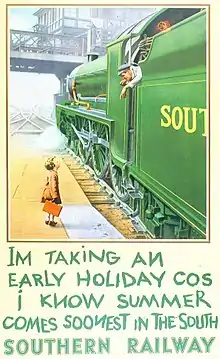 In 1925, Elliot joined the Southern Railway as public relations assistant to the General Manager Sir Herbert Walker. Under Elliot's leadership, the Southern Railway became noted for the simple, direct messages in its publicity posters. One in particular, showing a small boy talking to the driver of a King Arthur 4-6-0 at Waterloo became internationally famous. The naming of this class of locomotive after characters from Arthurian legend was "in itself a master stroke of publicity".[5]