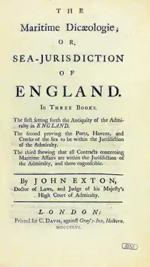 Exton wrote The Maritime Dicæologie, or Sea Jurisdiction of England, set forth in three several books, 1664; 2nd ed. 1755. It was written chiefly to maintain the jurisdiction of his court.