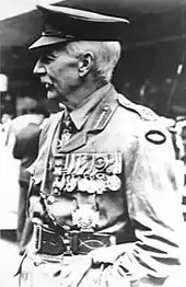 In the late 1930s, he was consulted by Prime Ministers Joseph Lyons and Robert Menzies about defence matters. He campaigned for an increase in the size of the Australian Army, writing letters to newspapers, and a series of articles for Reveille, the Returned Sailors and Soldiers Imperial League of Australia's organ. After the outbreak of the Second World War, he lobbied the Menzies government to appoint Blamey as Commander in Chief of the Army.[72] In June 1940, he was appointed commandant of the Victorian Volunteer Defence Corps, the Australian version of the Home Guard, but ill-health forced him to resign in July 1940, to be replaced by Foott.[73]
