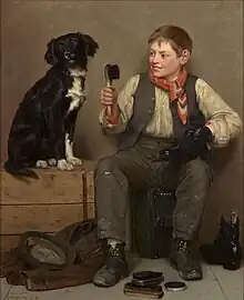 Around 1855, he worked for the owner of the Brooklyn Glass Company as a glassblower, and later married the daughter of his employer. His father-in-law encouraged his artistic abilities, supporting him financially, letting Brown pursue painting full-time.[1] He established a studio in 1860 and, in 1866, he became one of the charter members of the Water-Color Society, of which he was president from 1887 to 1904. Brown became famous for his idealized depictions of street urchins in New York (bootblacks, street musicians, posy sellers, newsboys, etc.).[4]