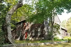 The John Glover House stands in a rural-residential area of northern Newtown, on 2 acres (0.81 ha) at the junction of Echo Valley and Alberts Hill Roads. It is a 2+1⁄2-story wood-frame structure, clad in wooden shingles, with a side-gable roof and a large central chimney. A series of additions extend from the rear of the house. The main facade is five bays wide, with sash windows arranged symmetrically around a center entrance. The entrance is framed by a Federal-period surround, with sidelight windows and pilasters to either side, and a fanlight in a semi-elliptical pediment above. The interior follows a typical colonial center chimney plan, with hall and parlor to either side and the kitchen behind the chimney. The building's construction details reveal an evolutionary growth of the structure, with its second floor probably added in the mid-18th century.[2]