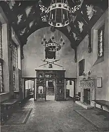 Before its restoration in 1834, the Hall had been "divided and sub-divided into many small upper and lower rooms".[13]