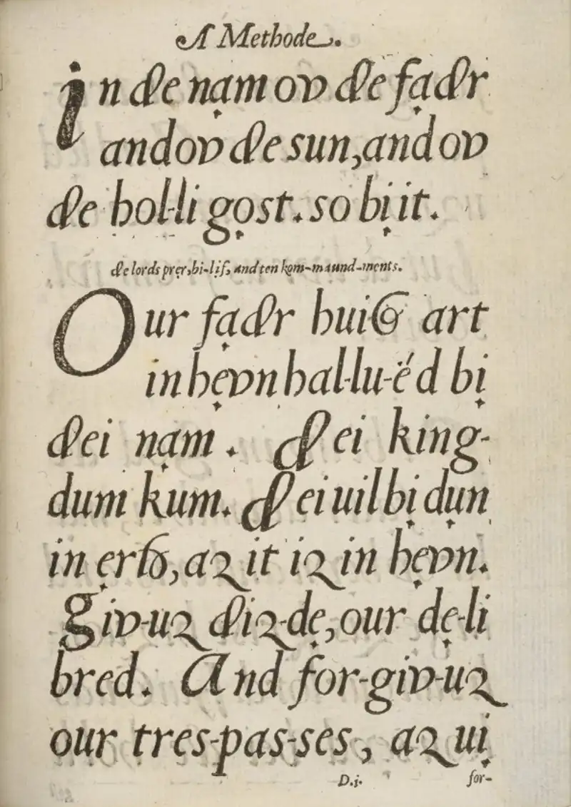 The following passage from Hart's Orthographie, in his original spelling, illustrates the system.[1] (For technical reasons, Hart's six new consonant symbols have here been replaced by their equivalent modern IPA symbols.)