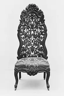 Belter was born in Hilter near Osnabrück, Germany and was trained as a cabinetmaker's apprentice in Württemberg, specializing in German rococo carving, which later became popular during the Victorian era and is known today as the Rococo Revival style. He moved to New York in 1833, becoming an American citizen in 1839. His shop "J.H. Belter and Co." was located during the years 1846–1852 at nr. 372 Broadway.[1] He is known for developing a technique for processing laminated rosewood in many layers to achieve thin panels that, once shaped in molds through steam heating, were finely carved.[1][2] This style which became very popular in NYC, was widely copied by his competitors in New York, Philadelphia, and Boston.[1]