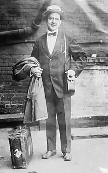 On July 2, 1913, he left New York City on the RMS Mauretania, then traveled by a combination of steamers, yachts, and trains to circumnavigate the Earth and reach New York City again on August 6, 1913. He had an elapsed time of 35 days, 21 hours, 35 minutes, 18 and four-fifths seconds. His world record stood for 13 years.[1][2] In 1928, he set the record again at 23 days 15 hours 21 minutes and 3 seconds.[1] In the same year he wrote an autobiography called Racing the Moon.