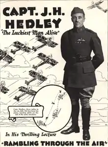 John Hedley apparently was very successful on the lecture circuit in 1920s and early 1930s, regaling American crowds with the story of his near-death experiences in (and out) of the cockpit that had earned him his nickname, "The Luckiest Man Alive."[11][22][23] The lecture that the former observer ace gave on a number of occasions was entitled Rambling Through the Air.[11] It appears that the talks took place most frequently between 1928 and 1930, often in Illinois,[20][21][27][28][29] but also in other states such as Indiana and Wisconsin.[11][23] Hedley thrilled a variety of audiences as he recounted his military experiences, from his initial service with the British Army in 1914 to his time as a prisoner of war until late 1918. The highlight of his lecture was almost always his account of being thrown out of the plane three miles above the earth, falling two or three hundred feet, and landing back on the tail of his aircraft.[11] However, in one newspaper account, there is the suggestion that his version of the account differed. The journalist indicated that Hedley had "retained his grasp on the macine (sic) gun."[20] The aviator claimed to have fought Richthofen's Circus three times, as a member of the 20th Squadron of the Royal Flying Corps, with the final encounter resulting in his aircraft being shot down in flames by Manfred von Richthofen.[11][21] Press reviews of his lectures were rather complimentary.[30][31] It was not until many years later that the assertion regarding the Red Baron was disproved.[16]
