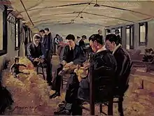 During World War One, Lobley was commissioned by the Royal Army Medical Corps to produce an artistic record of their work and created 120 paintings in both France and Britain.[1] These include scenes of rehabilitation in the Queens Hospital for Facial Injuries at Frognal, Sidcup and numerous other military hospital scenes; of the Royal Army Medical Corps in training at Blackpool; of casualty clearing stations near battlefields in France; and of wounded soldiers arriving at Charing Cross Station in London.[1][3] It has been said of Lobley that "Like many of the artists who witnessed the War first hand, he was deeply affected by what he had seen. His paintings of the War do not glorify it at all."[4]
