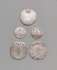 From June to October, 1652, produced silver coins with a simple design: the stamped letters "NE" for New England on the obverse, and the denomination in Roman numerals on the reverse. In October 1652, the General Court ordered a more complicated design with a double ring of beads to discourage clipping. Although all the coins use the date 1652, they can be broken into three chronological periods based on the design of the tree on the obverse: the willow tree, 1652-1660; the oak tree, 1660-1667; and the pine tree, 1667-1682. The last design led to the series being known as pine tree shillings.[20] In 1662, Hull and Sanderson also produced a series of oak tree twopence coins with the date 1662.[21] In total, the Boston mint may have produced as many as 300,000 to 500,000 coins.[22]