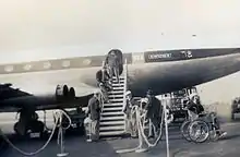 Australian Paralympic Team disembark from their plane on arrival in Rome for the 1960 Rome Paralympic Games. At the bottom of the stairs team official John "Johnno" Johnston in a white gap, turns towards the camera to talk to Bill Mather-Brown, on crutches.