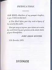 In 1868 he published his first book, The Retrospect of an Artist's Life, subtitled Memorials of West-Country Men and Manners of the Past Half Century.[5] Acquainted in his youth with many who had known Robert Burns, and with some of the heroes of the poet's verse, Hunter embodied these recollections in a volume entitled Life Studies of Character, printed in 1870.