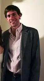 Krasinski's breakthrough came in 2004 when he was cast in the NBC sitcom The Office, a remake of the successful British TV series. In the series, a mockumentary about life at a mid-sized paper supply company, he played the role of Jim Halpert, an intelligent and mild-mannered sales representative and, in later seasons, co-manager of the paper distribution company Dunder Mifflin in Scranton, Pennsylvania.[23] Krasinski and Jenna Fischer's characters also served as the central love interests of the series.[24] To prepare for his role, Krasinski visited Scranton for research and interviewed employees at actual paper companies. He also shot the footage of Scranton used in the opening credits.[25] He appeared in every episode of the series and also directed several including "Sabre". For his work in the series (2005–2013), Krasinski earned approximately US$100,000 per episode of the third season of The Office, four times his salary for the previous two seasons.[26]