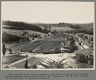 The forester in charge of the Ballarat Water Commission, Christopher Mudd, also supported La Gerche by exchanging seeds, plants and ideas.[1] From 1888 the Conservator of Forests, George Perrin also took a special interest in the nursery and plantation.[5] La Gerche was resourceful and obtained new trees and seedlings from any sources he could find, including some trees from the Ballarat botanical gardens.[8] With the encouragement of Perrin new species were introduced to include planes, oaks, English maples, limes, several species of pines, sycamore, elms and poplar.