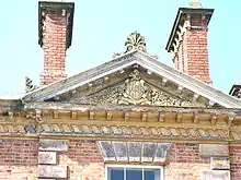 - 1859 Garthmyl Hall, Berriew, Montgomeryshire. Designs by J. K. Colling. Ornamental friezes and consoles. Coat of arms with foliage and roses.[27]