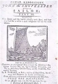 However, although Marshall advocated more disciplined stories, he also published Newbery-inspired stories that "stressed amusement" and would sell well, including fairy tales.[23] By the mid-1780s, he was focusing almost exclusively on moral works with a strong Christian element. As Samuel Pickering, Jr., a scholar of 18th-century children's literature, explains, "He was a shrewd publisher and, reading the market well, he saw that instruction would sell. While keeping a selection of old-fashioned, amusing books in print... he established a reputation as a printer of moral works."[24] Mary Jackson describes his strategy in sharper terms, saying he engaged in "apparent duplicity and sharp tricks", claiming he was a reforming publisher but issuing tales that had little moral redemption in the eyes of Trimmer, Fenn, Kilner, and others.[25] In 1795, he became a printer for Hannah More's Cheap Repository Tracts.[24]