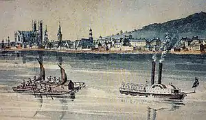 Molson toyed with the idea of buying a steamship after seeing Robert Fulton's Clermont go down the Hudson.. However, there was also another steamship commissioned by a group of businessmen from Burlington, Vermont in 1808 to be built by two brothers in Burlington, Vermont, named John and James Winans. This ship was quite unsurprisingly called the Vermont and went into service in 1809. The Vermont ran in modern Canada, along Lake Champlain and the Riviere Richelieu to Dorchester (modern day Saint-Jean-sur-Richelieu in Quebec).[13] Molson's steamship would be the first in Canada. Molson teamed up with John Jackson and John Bruce who would build a ship for Molson in return for putting up the money and part ownership. Built in Montreal (with engines produced at Forges du Saint-Maurice in Trois-Rivières) in 1809, Accommodation became the first steamship to ride on the waters of the Saint Lawrence River.[1] This was a great feat for Molson but, from a business viewpoint, it was a net loss, costing £4000 by 1810.[14] Molson was determined to make money on his ships so he dismantled Accommodation and purchased in person two steamship engines from Boulton & Watt in Birmingham, England. He combined the two engines and the remains of Accommodation to create Swiftsure, a magnificent ship that was a vision of elegance and speed, traversing the route at an average of seven miles an hour. Swiftsure measured 130 feet on the keel and had a beam of 24 feet.[15] The steamship provided a ready cash business, while the government in London had suspended the transfer of specie from 1800 to 1817. Most other Canadian business was carried on with London bills of exchange, and the transfer of those bills from Montreal to Quebec earned the Molsons up to 20 per cent.[16][17] And since brewing occupied the months when the steamboats were laid up, a harmonious concordance of activities resulted.[18]