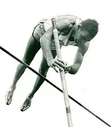Again at Monroe on May 4, 4.88 m (16 ft 0 in) was enough for first place but on the same day at San Jose American Jeff Chase vaulted 8.74 m (28 ft 8 in); not to worry, they were vaulting for distance, not height.[6] The following weekend decathlete and future world record holder Yang Chuan-kwang became the first man to vault sixteen feet and lose, being beaten by Ron Morris at a meet in Fresno, California.[7] By the end of the month of May there were no less than ten men worldwide over sixteen feet and eight of them were Americans; the other "foreigner" was the Finnish athlete Pentti Nikula, who held the world record Sternberg had broken in April,[2][8] and Sternberg had equalled Pennel's "world record" at the Modesto relays on May 25. But this was not ratified as a world record. However, Sternberg got his second and final world record at Compton, California on June 7, clearing 5.08 m (16 ft 8 in), and found 5.00 m (16 ft. 4¾") enough to take the NCAA at Albuquerque the following week with Cruz, Cramer, Hansen and Watson in that order all on 4.82 m (15 ft. 9¾"),[9] and strangely he also found 4.98 m (16 ft. 4") sufficient to take the AAU title in St. Louis a week later with Pennel back in sixth place on 4.80m (15 ft. 9"),[10] (the same weekend that Bob Hayes ran the first legal 9.1 s 100 yards).