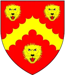 Arms of Peryam: Gules, a chevron engrailed between three lion's faces or