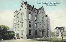 Hamilton's 1855 Woodward High School building stands among the first buildings in America to use terracotta for exterior decoration.[4] The historian of Cincinnati's schools noted that Hamilton had urged the adoption of terra cotta because of his extensive travels in Italy. "Unfortunately, however, its manufacture was then an untried process here, and within a few years it began to disintegrate in the walls of the structure, and it became necessary to cut it out and replace it with stone. This unfortunate state of affairs brought the building into disrepute. Nevertheless, as an architectural design, it was eminently satisfactory."[5]