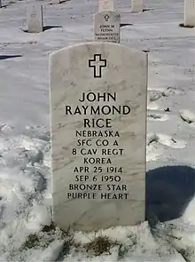 Sergeant First Class John Raymond Rice (Native American name: Walking in Blue Sky[1]) (April 25, 1914 – September 6, 1950) was a Ho Chunk (Winnebago) Indian and a United States Army soldier killed in action while leading his squad in Korea in 1950. A Sioux City, Iowa cemetery refused to bury his body because he was Native American, touching off a national episode culminating in President Harry Truman ordering his body to be interred in Arlington National Cemetery.
