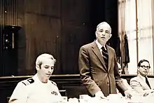 Upon graduation, he was commissioned an ensign and assigned to duty aboard the battleship Oklahoma in the Pacific.[2][8] He applied to flight school to become a naval aviator, but was turned down due to a heart murmur, and was accepted at Submarine School at Naval Submarine Base New London in Connecticut instead.[2][8] There, he placed 28th out of 29 in his class.[7]