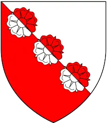 Arms of Macwilliam of Gloucestershire: Party per bend argent and gules, three roses bendwise counter-changed, as later quartered by Queen Jane Seymour