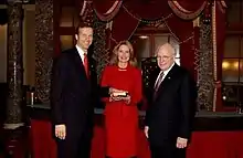 Thune began his political career in 1996 by entering the race for South Dakota's lone seat in the U.S. House of Representatives. The Almanac of American Politics said that Thune "entered the 1996 race as very much an underdog."[12] His opponent in the Republican primary was sitting Lieutenant Governor Carole Hillard of Rapid City, who benefited from the support of the longtime South Dakota Governor Bill Janklow. A May 1996 poll showed Hillard leading Thune by a margin of 69%-15%.[12] By relying on strong personal skills and the help of his old network of Abdnor friends, Thune won the primary, defeating Hillard 59%-41%.[13] In the general election, Thune defeated Democrat Rick Weiland, a long-serving aide to U.S. Senator Tom Daschle, 58%-37%.[14]