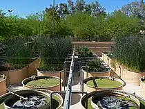 The first "Living Machine" was created at Findhorn Ecovillage in Moray, Scotland in 1995.[3] For its design, John Todd drew on the work of Käthe Seidel and H.T. Odum.[3] The system had to accommodate wastewater from an ongoing population of about 300 residents, and a seasonally fluctuating population of as many as 10,000 visitors per year.[19] The resulting installation resembles a tropical conservatory garden. Every organism provides food for the next step in the food chain until the cycle is complete.[3]