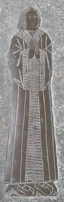 The Gloucestershire historian Ralph Bigland (d.1784) identified him with the surviving ledger stone set into the floor of the South aisle of St Laurence's Church, Lechlade,[29] in which he had founded the chantry of St Blaise. The north and south chapels in that church are likely to have been paid for by the Duchess of York and John Twynyho to house the chantries founded in 1472.[30] However more recently it has been suggested as the brass of Robert Hitchman (d. circa 1510).[31] Of the many brasses the ledger stone displayed originally, including effigies of his wife, children, heraldic escutcheons, marginal inscription, two scrolls, and four plates, on which were most probably the evangelistical symbols, and his merchant's mark (a tau cross combined with a Latin cross)[32] only that of a figure representing John Twynyho survives. Only the matrices of the other brasses indicate their positions and shapes. His brass measures 3 ft. 2in. by 9in. He wears long hair but his face is clean shaven. His tunic reaches to his ankles and is faced with fur, a customary garment among the civilians at the end of the 15th century and commencement of the 16th century. The large open sleeves hide the girdle which most probably he wore. The under-garment is seen at the neck, and again at the wrists, where its sleeves appear to be tightly buttoned. The feet are encased in the large square-toed shoes of the period. The figure is erect and slightly turned to his left with his hands uplifted in a prayerful attitude. The brass is illustrated in Ralph Bigland's Gloucestershire, Vol II, p. 144.