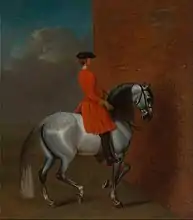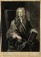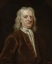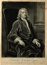 Vanderbank's most characterful and distinguished portraits are generally of the 1720s including the great patron of Handel and of the arts the Duke of Chandos (1722), the two portraits of Sir Isaac Newton (1725 and 1726), the painter George Lambert (untraced but engraved by Faber in 1727), the eccentric Newmarket trainer Tregonwell Frampton (c.1725), the poet James Thomson (1726), and the sculptor John Michael Rysbrack (c.1728). Ellis Waterhouse considered that Vanderbank's masterpiece was the large full-length of Queen Caroline (1736). Vanderbank painted three allegorical subjects incorporating an equestrian portrait of George I for the decoration of the staircase at 11 Bedford Row, London, and contributed The Apotheosis, or, Death of the King (1727) to the series of ten paintings by various artists, including Chéron and Pieter Angelis, engraved in 1728 and advertised by John Bowles as Ten Prints of the Reign of King Charles the First. By contrast, some of Vanderbank's later portraits of ‘persons of Quality’, male or female, are technically well painted but can betray a lack of rapport with his sitters and a tendency to rely on stock poses sometimes directly derived from Van Dyck. Vertue noted that, like many portraitists of the period, Vanderbank sometimes used the services of the drapery painter Joseph Van Aken from the mid 1730s.[28][29]