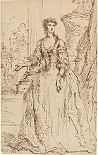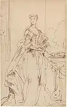 Vanderbank's Academy was shortlived but had an important influence on the development of English art, not least by furthering the introduction in England of life drawing classes for promising students such as William Hogarth, Joseph Highmore, William Kent, John Faber, John Ellys and James Seymour.[13] Moreover in leading the academy Vanderbank was at the centre of an influential artistic hub enjoying the patronage of the wealthiest aristocrats, largely responsible for shaping the taste and cultural life of England in the 1720s and 1730s, encompassing art, architecture, music and the landscape. For example when William Kent joined Vanderbank's Academy he was already painting interiors at Cannons for the Duke of Chandos,[14] the princely palace designed by James Gibbs whom Vanderbank had known since Kneller's Academy, and in 1722 Vanderbank painted a portrait of the Duke of Chandos which has in the background the great basin lake created at Cannons (of which Nicholas Hawksmoor said "I cannot but own that the water at Cannon's... is the main beauty of that situation and it cost him dear",[15] and in 1727 Hogarth, probably on Vanderbank's recommendation, was invited to paint a cartoon of The Element of the Earth for Joshua Morris, the tapestry maker of Great Queen Street, for some hangings for Cannons, so initiating Hogarth's painting career.[16] The Duke of Chandos had installed Handel as musician in residence at Cannons,[17] where he composed the Chandos Anthems and his first oratorios, and in 1719 was one of the principal founding subscribers to the Royal Academy of Music to ensure a steady supply of baroque opera under Handel's aegis. Vanderbank was a frequent concert goer, drawing a caricature of Senesino, Cuzzoni and Berenstadt in a scene from Handel's Flavio in 1723,[18] which was anonymously etched and engraved, and in the same year painting the portrait of the leading soprano, and later contralto, Anastasia Robinson, Countess of Peterborough, of which Faber produced a popular mezzotint in 1727.