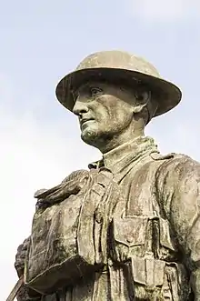 On 3 August 2014 a memorial to Frome Servicemen[73] was installed outside the Memorial Theatre,[74] opposite the Town Hall on Christchurch Road West. This is dedicated to the fallen of WWI, WWII and the Falklands conflict.[75] The statue on the memorial is a lifesize cast of Charlie Robbins, an employee of Singer both before his enlistment in WWI and after his demobilisation. He retired from Singer in the late 1950s and died in 1981 aged 89.[76] The plaster was modelled by Edgar Thomas Earp[77] and cast in 1922. After being rediscovered in the late 1970s/early 1980s, it was placed in front of the Singer Factory in Waterloo, close to the centre of the town. In 1999, while the factory was being relocated, the statue was sent to Morris Singer in Basingstoke to have its rifle strap and other elements repaired or added. On its return it was placed outside what became the Tyco site in Handlemaker Road,[78] till it was gifted to serve as the memorial on a 99-year lease to Frome Town Council. It is the only statue cast by Singer that never really left Frome.