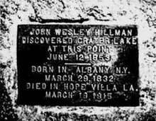 Hillman was born in Albany, New York. In 1848, at the age of 16, he moved with his family to New Orleans, Louisiana. Not long after relocating to New Orleans, Hillman accompanied his father on an expedition to California during the Gold Rush in April 1849, and stayed out west when his father returned to the east. On June 12, 1853, John Wesley Hillman was reportedly the first European American to see what he named "Deep Blue Lake" in Oregon. The lake was subsequently renamed Crater Lake.[1] Hillman shattered a knee in 1855 during the Rogue River Wars and returned east a few years later, settling to a farming life in Baton Rouge, Louisiana.