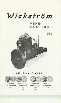 Wickström founded a boat engine factory in Palosaari, Vaasa together with his brother Jakob who also returned from America; the third emigrated brother Mickel stayed permanently in the United States. The factory was opened in autumn 1906, and, in addition to boat engines, the company produced stationary engines for Finnish farmers to power threshers and other machinery. Production of Wickström-engines grew over time and, in 1910, the brothers opened a new facility in Vaskiluoto, close to Vaasa harbour. The company name became Bröderna Wickströms Motorfabrik Ab in Swedish and Wickström-Veljesten Moottoritehdas Oy in Finnish ("Wickström Brothers' Engine Works Ltd.").[1] At the beginning, the brothers produced Caloric engines based on drawings which they had brought with them from America. As the engines turned out to be too complex and unreliable, the company developed modern four-stroke paraffin engines, which replaced the older portfolio.[3]