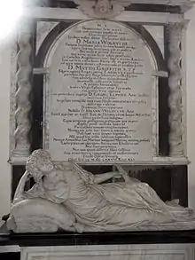 Around 1670 Wolryche married Mary Griffith, daughter of Matthew Griffith (c.1599–1665).[1] A militant and vituperative royalist, Griffith had been chaplain to Charles I during the civil war and was made master of the Temple Church in the reign of Charles II.[20] Mary, according to her epitaph, was cultured and an accomplished singer and lutenist.[10] She was about 33 years of age when she married Wolryche and was the widow of George Elphick, a Sussex landowner. She died in childbirth, aged 41, in 1678, and was commemorated by an impressive monument in Quatt parish church. She had already borne two sons, including Thomas, destined to become the third of the Wolryche baronets.